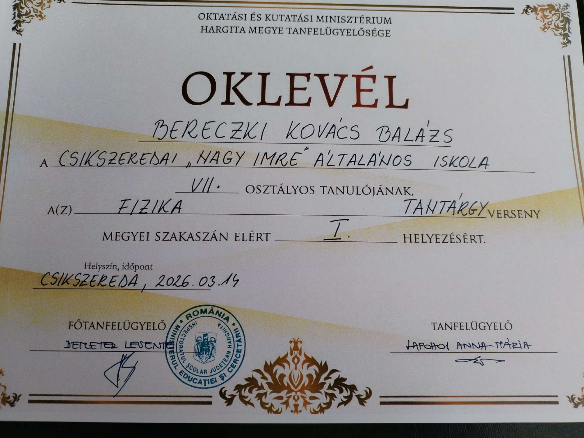 A fizika tantárgyverseny megyei szakasza 2026. március 14-én volt a csíkszeredai Kós Károly Szakközépiskolában. Iskolánkat Bereczki Kovács Balázs VII. B osztályos tanuló képviselte, aki I. díjban részesült!