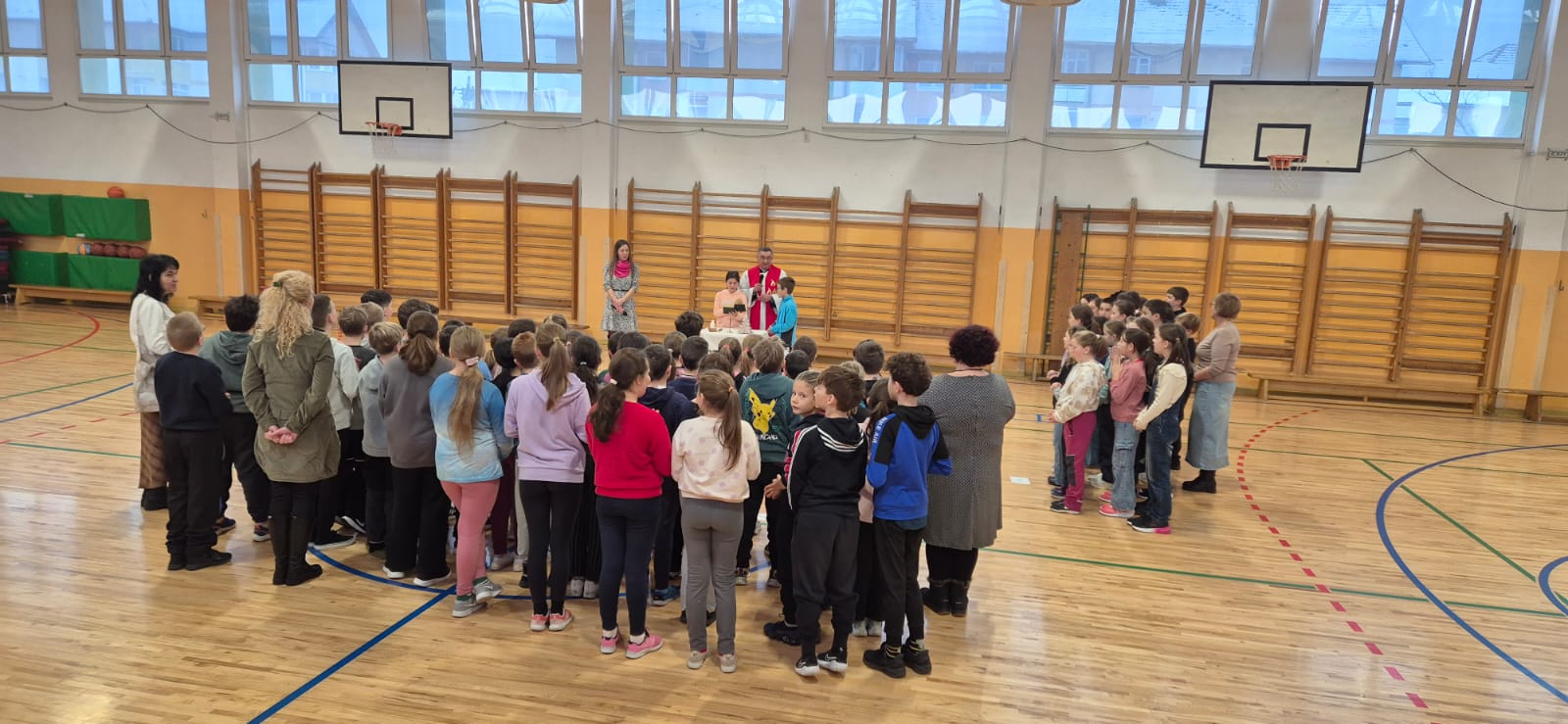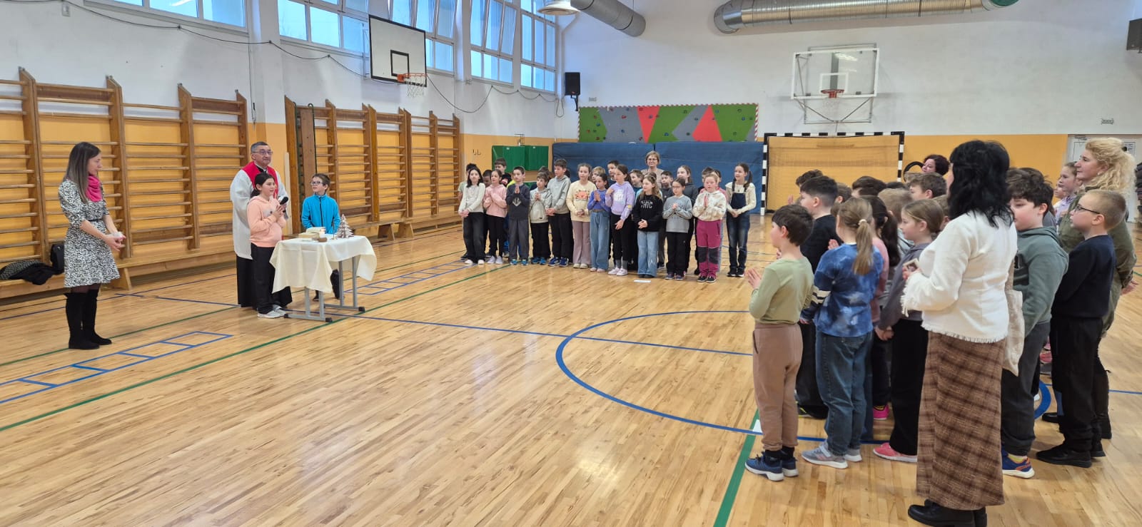 Január 16-án Darvas Kozma József esperes úr látogatott el iskolánkba, hogy elvégezze az intézmény házszentelését. Az ünnepi alkalmon a szent Keresztet az elsőáldozásra készülő harmadik osztályos tanulók fogadták. A meghitt eseményt a harmadikosok éneke tette még szebbé, közülük pedig néhányan az esperes úr segítőiként is közreműködtek. Örömteli és emlékezetes pillanat volt mindannyiunk számára.