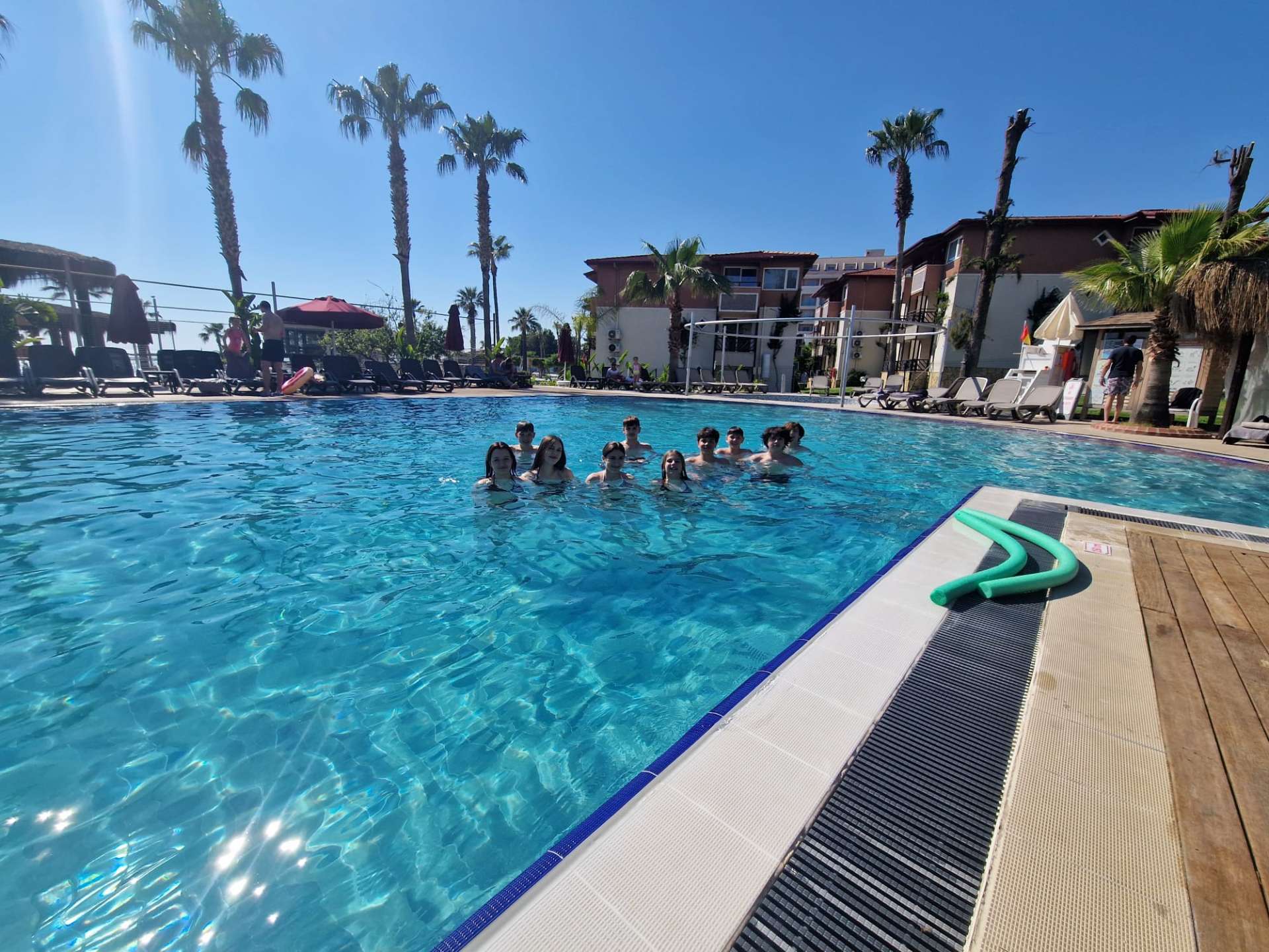 Délután fél háromkor indultunk vissza a szállásra. Rövid pihenő után lementünk fürödni: először a tengerhez sétáltunk, de túl hidegnek találtuk, így végül a medencét választottuk. Pár órát úsztunk és napoztunk, majd felmentünk átöltözni és megpihenni. Este hétkor vacsoráztunk, ahol sokféle finom étel közül választhattunk.