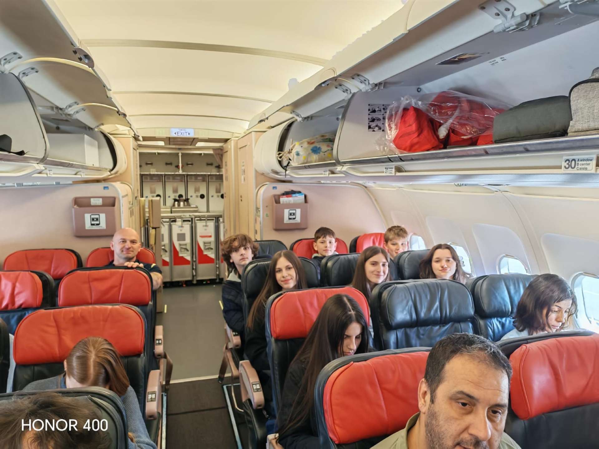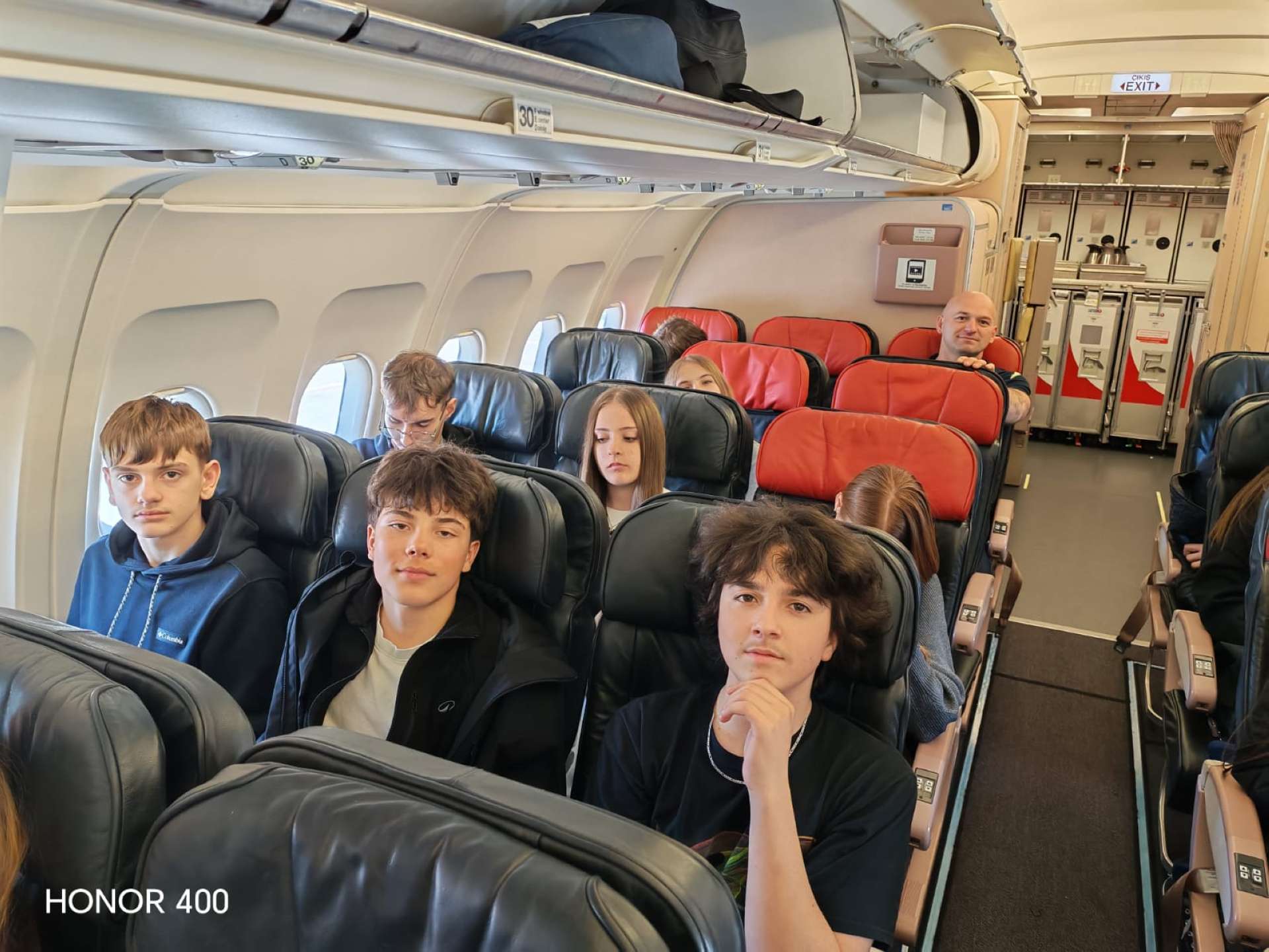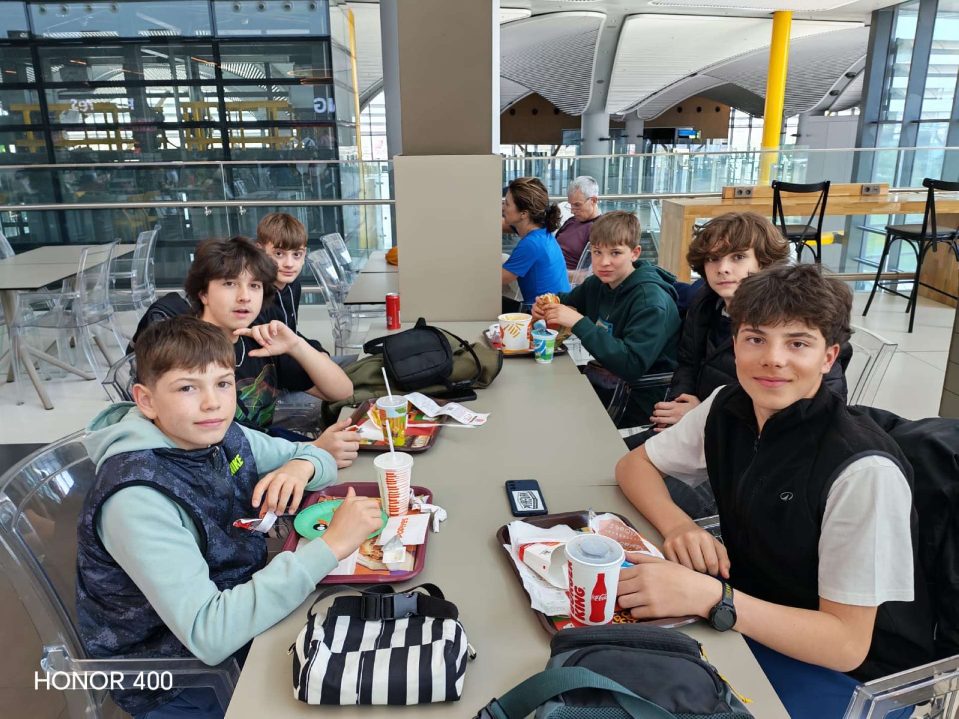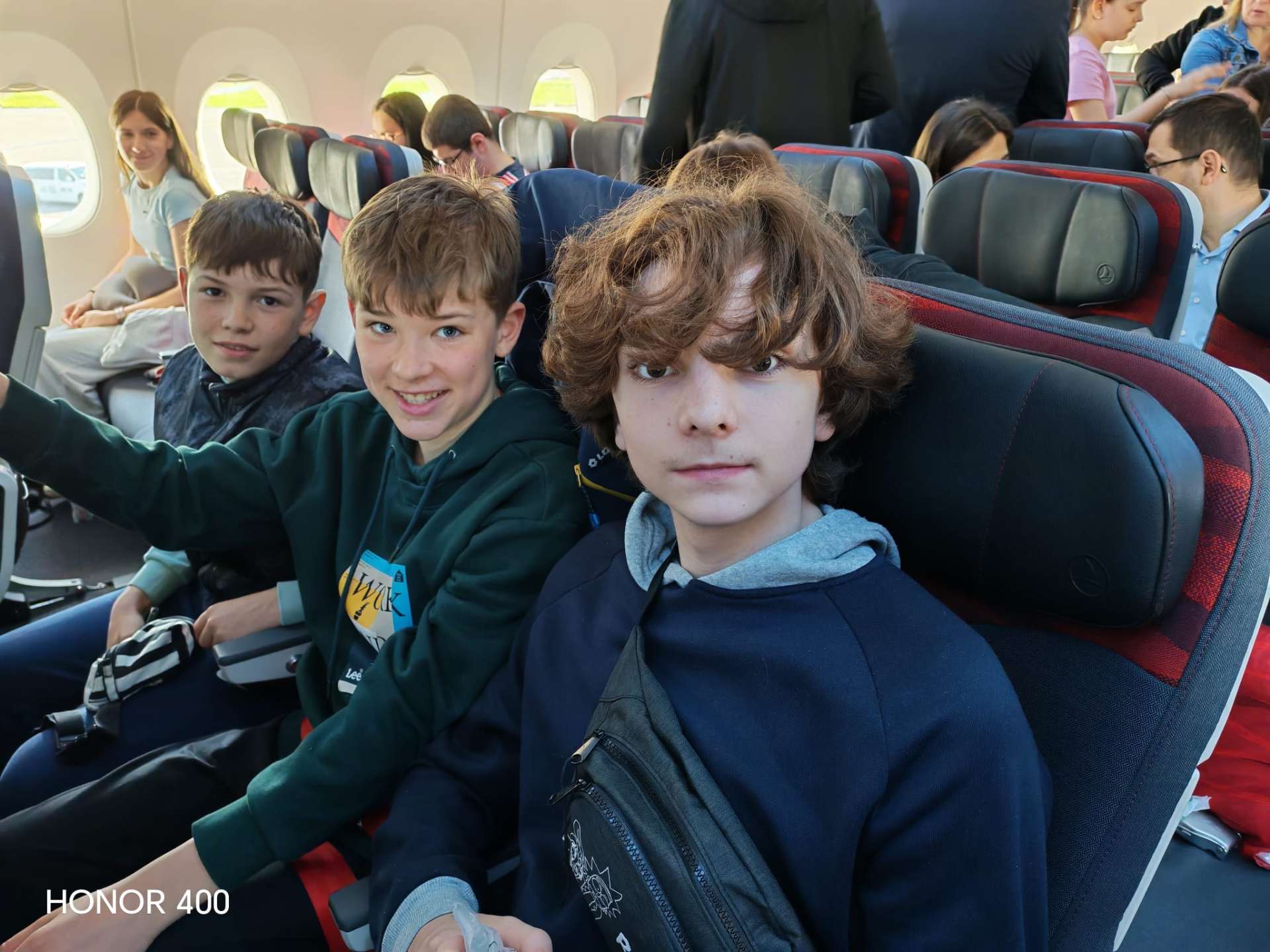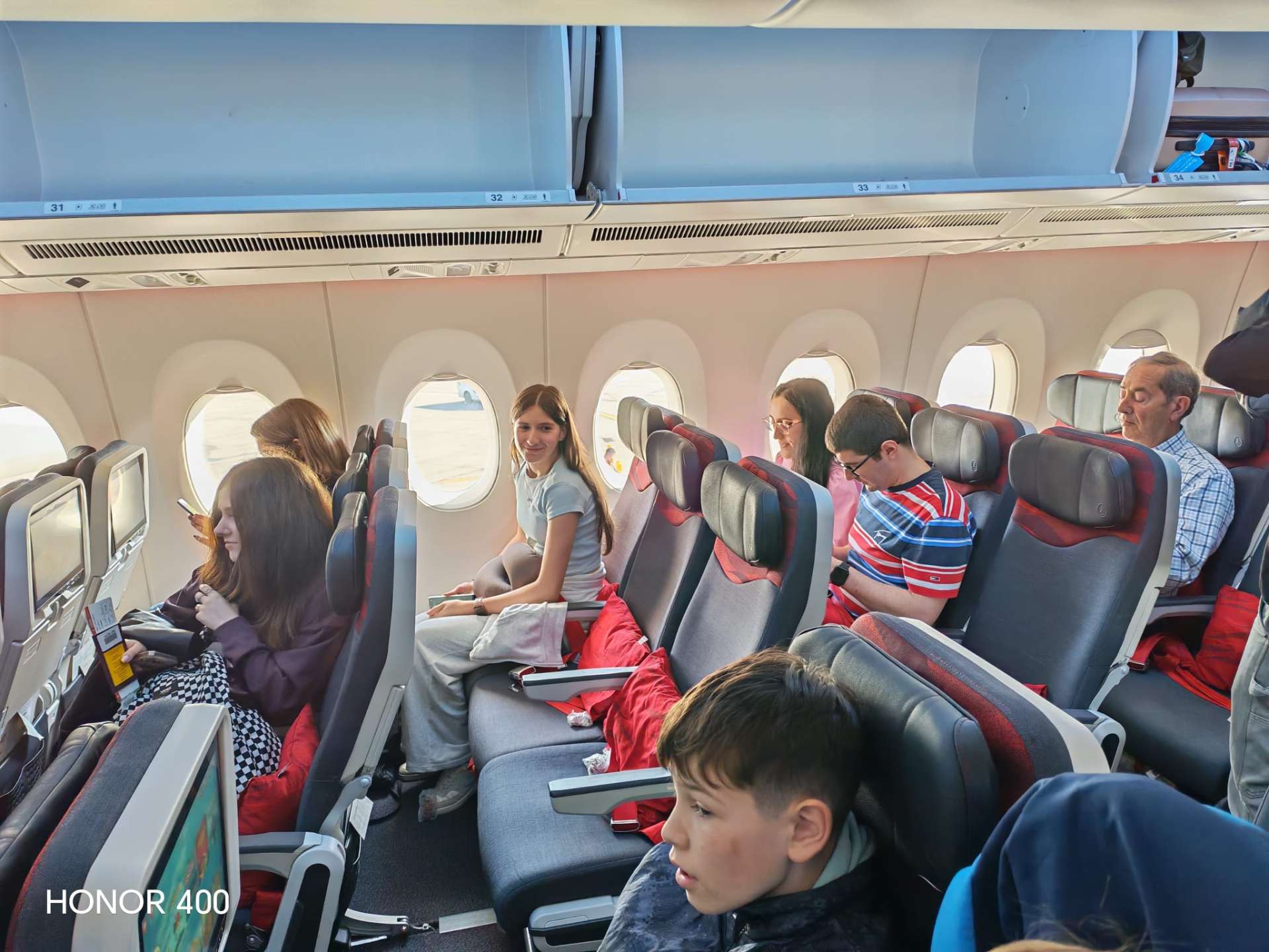 Reggel hat óra körül megérkeztünk a reptérre. Rövid idő múlva leadtuk a bőröndjeinket, majd átestünk az ellenőrzésen, ami szerencsére zökkenőmentesen zajlott. Ezután átmentünk a vámon, majd hosszabb várakozás következett a beszállásig. Egy kisebb késés után felszálltunk a gépre, ahol a székek hátán lévő monitorokon filmet nézhettünk, zenét hallgathattunk, játszhattunk, követhettük a repülő útját, és reggelit is kaptunk.